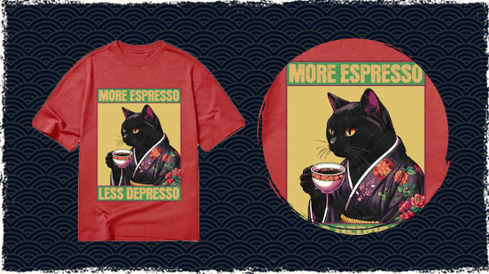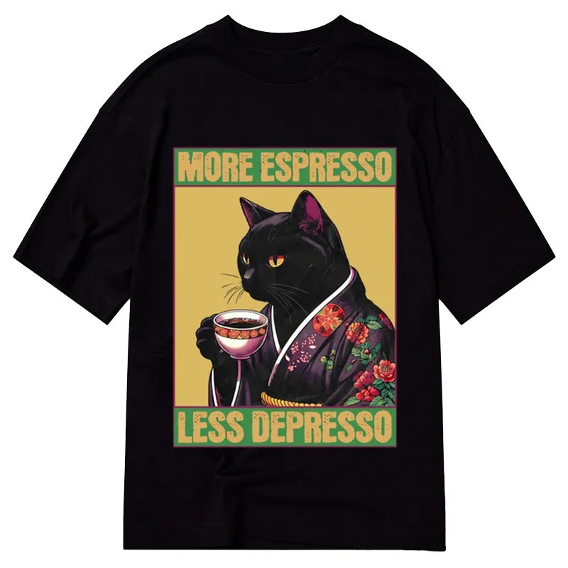 Featuring a quirky cat enjoying a cup of coffee, the design is both amusing and relatable. The phrase “More Espresso, Less Depresso” adds a playful twist that resonates with coffee enthusiasts who appreciate a lighthearted approach to life’s challenges. The vibrant colors and high-quality print ensure that the design stands out, while the soft fabric offers comfort for everyday wear. Its unique blend of humor and style makes it a popular choice among those looking to express their personality through fashion.