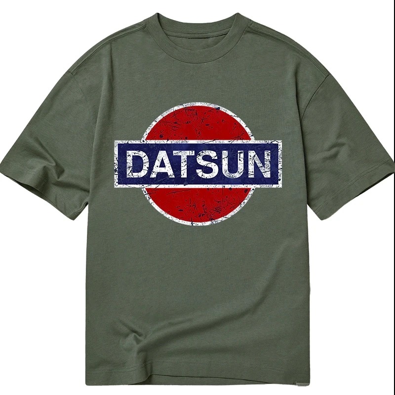The design features a bold Datsun logo in striking red and blue, set against an earthy green background that evokes a classic, rugged feel. This color combination not only highlights the vintage appeal but also makes the shirt versatile for casual wear. The high-quality cotton material ensures comfort and durability, making it a favorite among car lovers who appreciate both style and substance. The t-shirt's design resonates with those who have a deep appreciation for automotive history, driving its popularity.