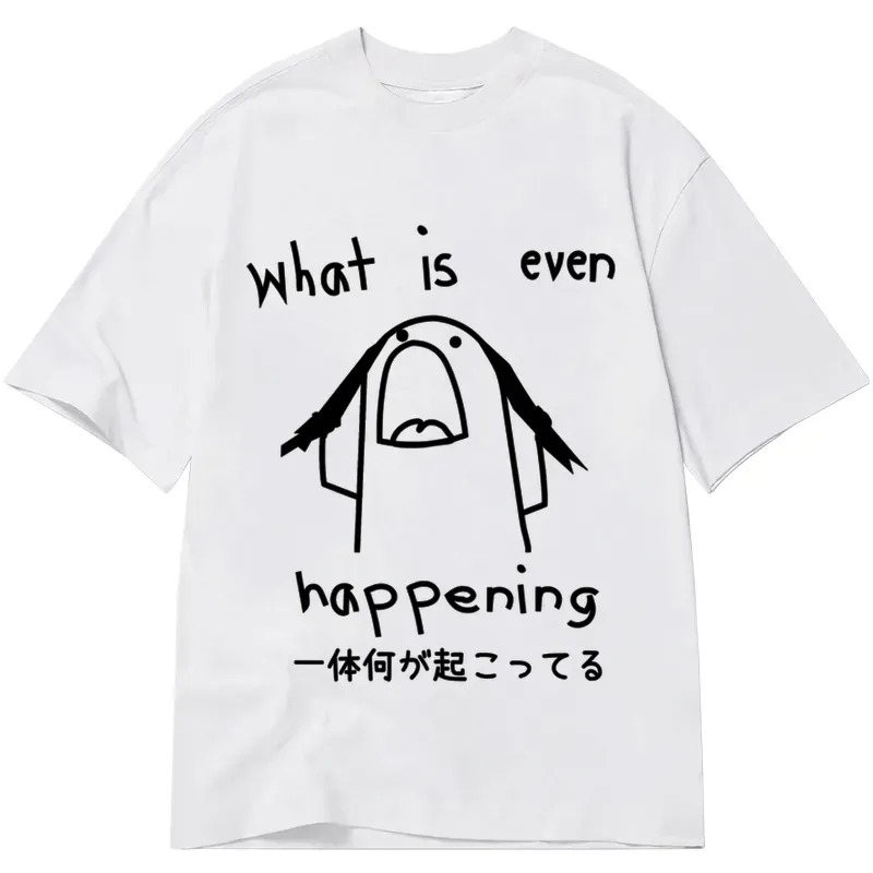 The simple yet expressive artwork, paired with the relatable phrase “What is even happening,” strikes a chord with those navigating the unpredictability of life. The addition of Japanese text adds an international flair, appealing to a global audience. Crafted from soft, durable material, this shirt is perfect for casual outings or lounging at home. Its humorous and relatable theme, combined with quality craftsmanship, drives its popularity among a diverse range of customers.