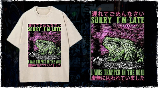 One design uses humor to address the universal experience of feeling lost yet resilient. By incorporating phrases like “SORRY I'M LATE, I WAS TRAPPED IN THE VOID,” the design captures a modern sentiment while maintaining a connection to the frog's symbolism of overcoming challenges. This reflects the Japanese spirit of perseverance, where resilience is celebrated.