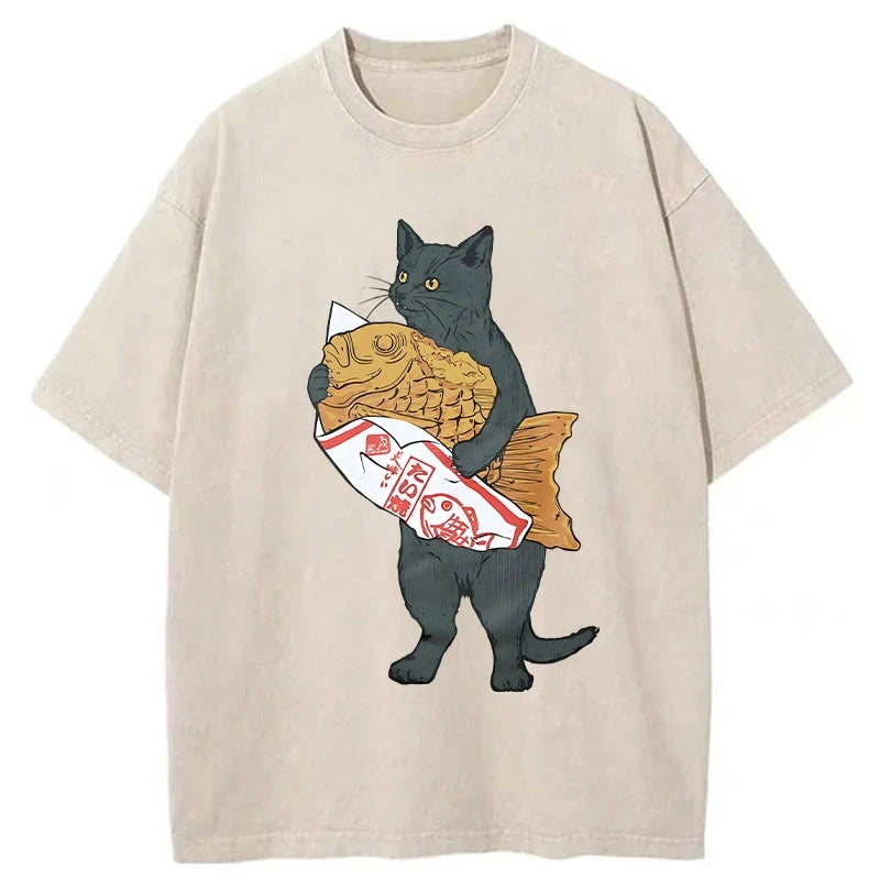 Tokyo-Tiger Cat Holding Taiyaki Washed T-Shirt