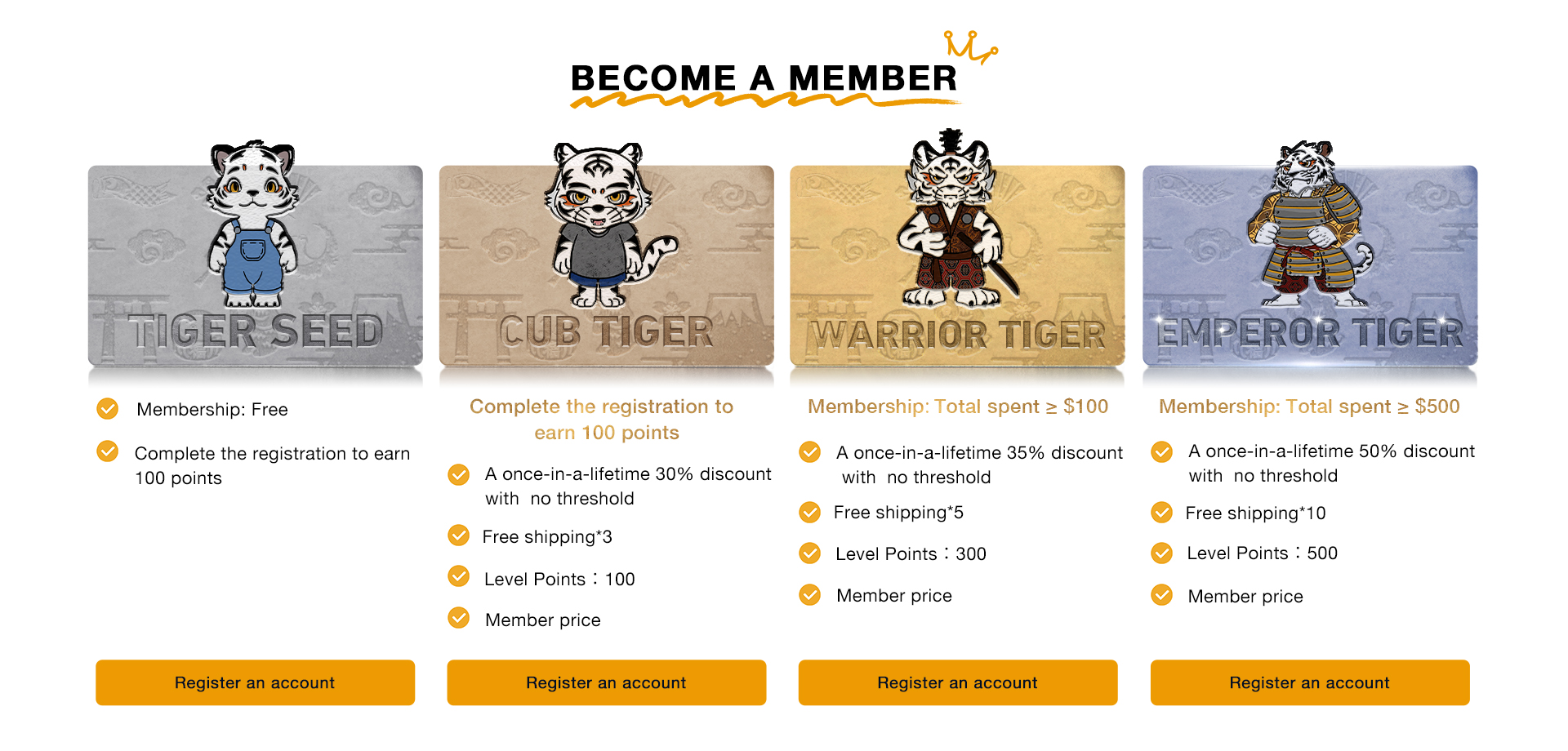 There are three levels of TokyoTiger membership: