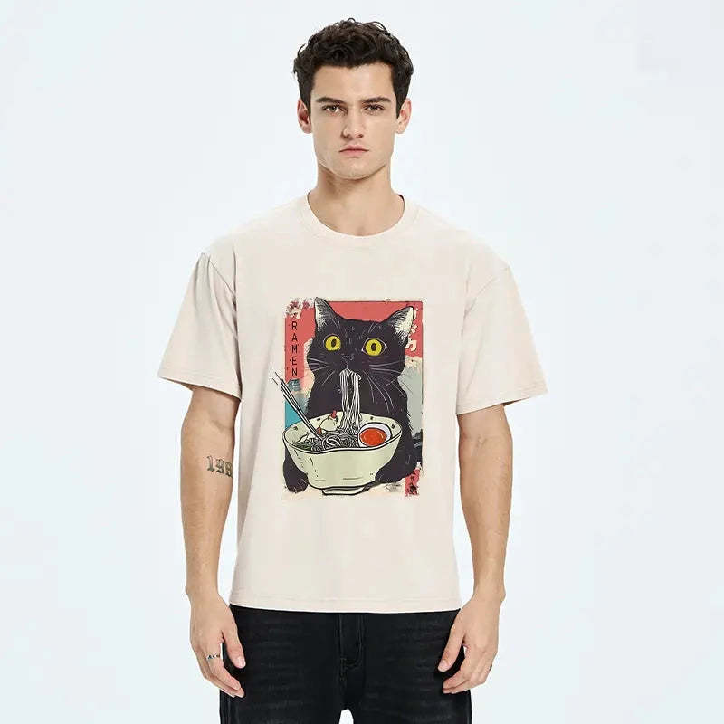 Tokyo-Tiger Cute Cat Eating Ramen Washed T-Shirt